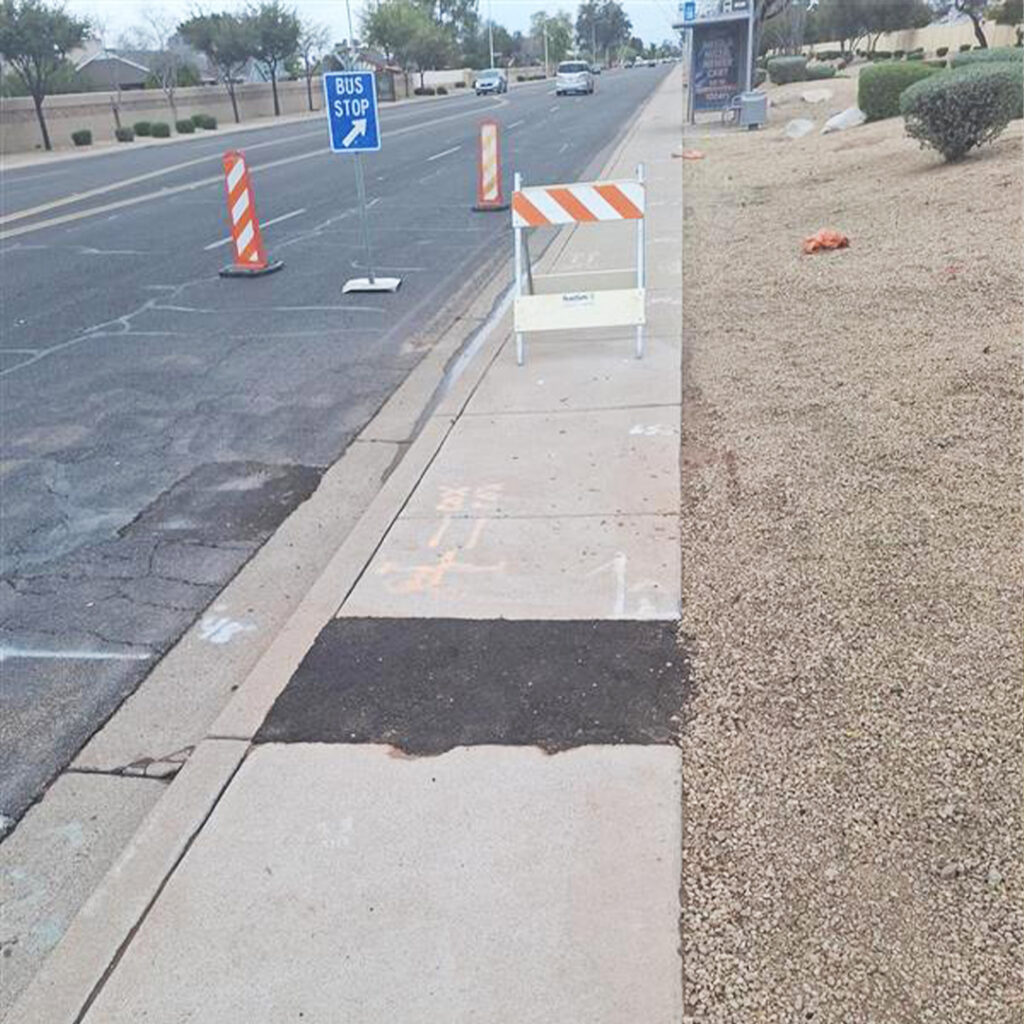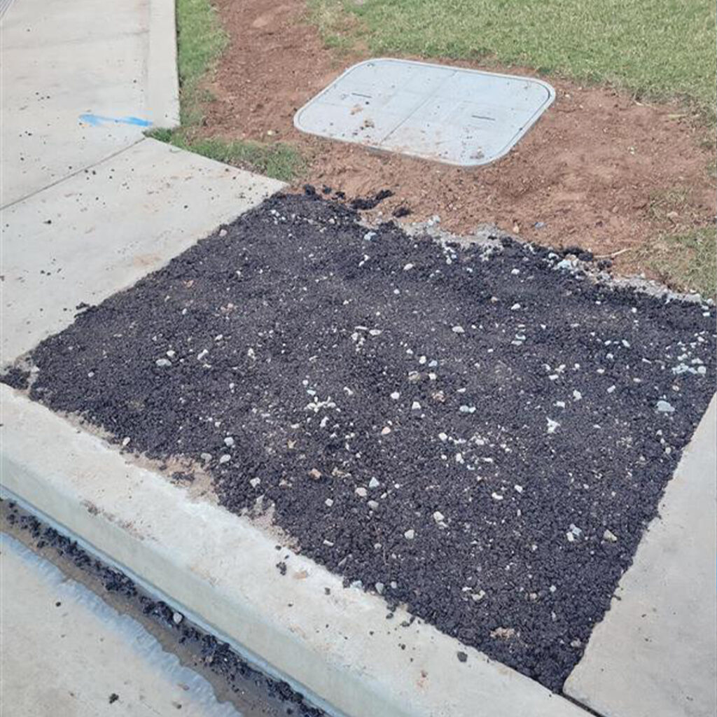 Examples of temporary patching during the installation process which will be replaced with permanent concrete/asphalt after installation:
