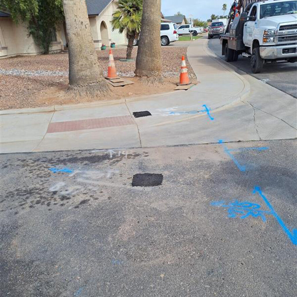 Pre-construction activities are 30-45 days ahead of construction. This involves utility companies placing paint on the ground within the (right of way) or streets and identifying existing utilities. If you live in an HOA, this is when contact to your HOA about the upcoming construction is made. This will allow HOAs time to locate their facilities in the right of way such as irrigation lines and notify their residents of the upcoming construction. As pre-construction activities are completing, you will see a new door hanger notifying you we are about to move into the construction phase.