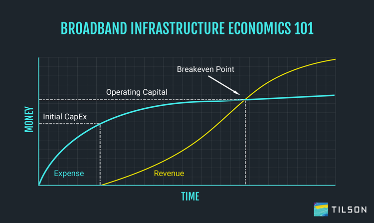 2. You must spend money to make money. To deliver service, you must connect customers. For fiber-to-the-premise networks, that means a drop cable and customer premise equipment (CPE) at every premise. For fixed wireless, that usually means radios with line of sight to each customer at every premise. Delivering service means you have labor, equipment, and materials costs for every customer connection. We refer to this as “success-based capital”. You have successfully acquired a customer; now you need to pay to connect them!