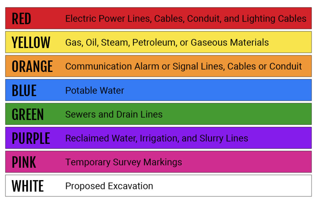 Beyond colors, there are also shapes, symbols, and words that may be used to help workers further understand the location, depth, or special circumstances of a utility. For example, a single utility line may be marked by one line to indicate its center, or it may be marked with an “H” shape with the parallel lines indicating the outer edges of the utility. Because these additional markings can get complex and require training to decipher, most general audiences only need to know the meaning of the colors. The important thing to note in these codes is that they are all part of a process for damage prevention and public safety.