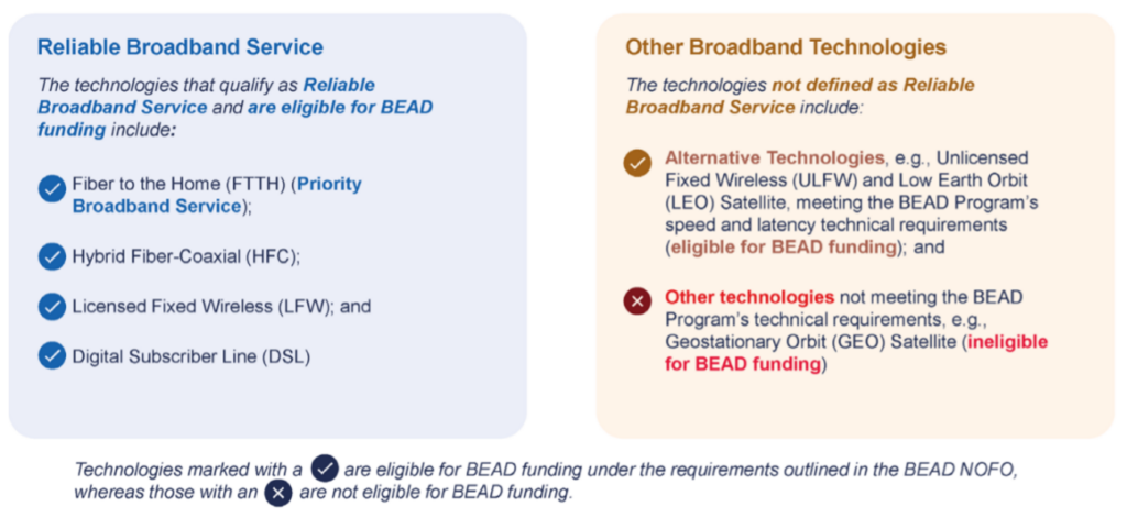 The BEAD Notice of Funding Opportunity (NOFO) established a clear hierarchy for awarding grants, prioritizing end-to-end fiber broadband projects first. States can then award grants to projects using other reliable broadband technologies, such as cable, hybrid fiber-coaxial networks, DSL, and terrestrial licensed fixed wireless service.1 If locations receive no acceptable bids utilizing these technologies, the state can consider proposals offering alternative technologies, such as Low Earth Orbit (LEO) satellite and fixed wireless networks using unlicensed spectrum exclusively.2 NTIA will also monitor which projects provide internet access for unserved vs. underserved communities to ensure funds are allocated appropriately.